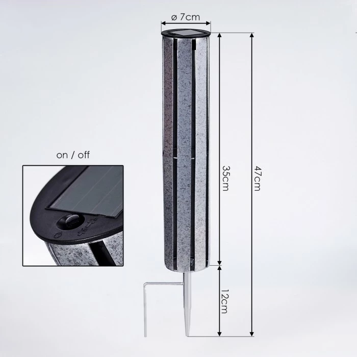 Besonderheiten: Die Leuchte verfügt über ein Solarpanel und einen eingebauten Akku mit einer Akkulaufzeit von ca. 6 – 8 Stunden.