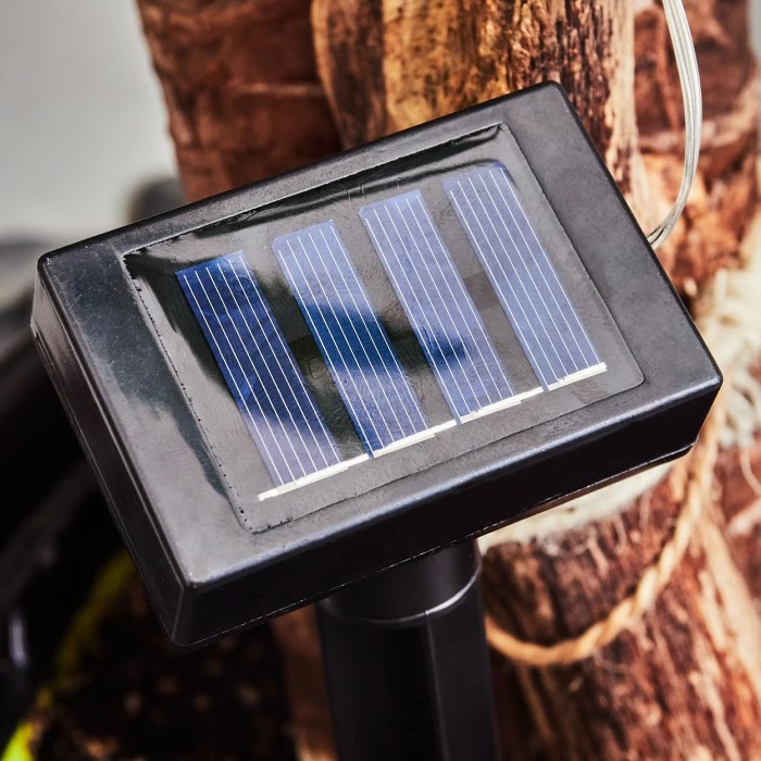 Dieser wird durch das Solarpanel aufgeladen. Es ist kein Stromanschluss nötig. Die Lichterkette verfügt zusätzlich über einen An-/Ausschalter.