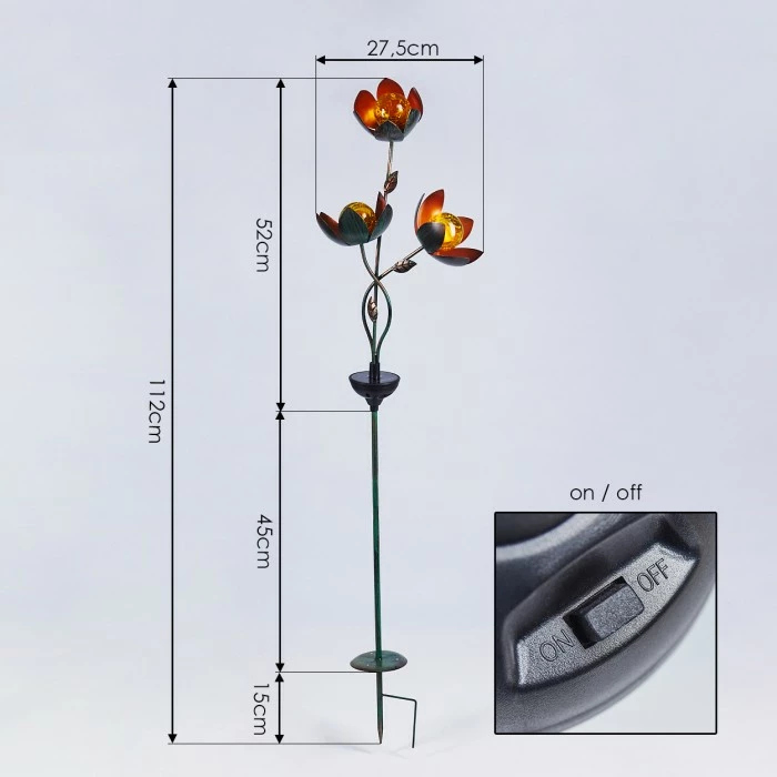 Die Leuchte verfügt über ein Solarpanel und einen eingebauten Akku mit einer Akkulaufzeit von ca. 6 – 8 Stunden. Dieser wird durch das Solarpanel aufgeladen. Es ist kein Stromanschluss nötig. Mittels Erdspieß kann die Solarleuchte an jeder beliebigen Stelle im Garten platziert werden. Durch den Schirm entsteht ein toller Lichteffekt auf dem Boden und an den Wänden. Diese Leuchte verfügt über einen An-/Ausschalter am Gehäuse.